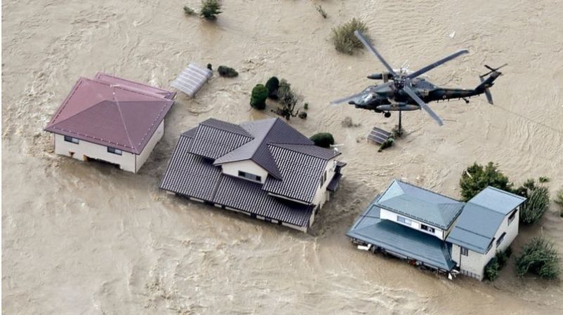 千曲河冲破河岸时,直升机援救困在房屋里的人们,来源:BBC
