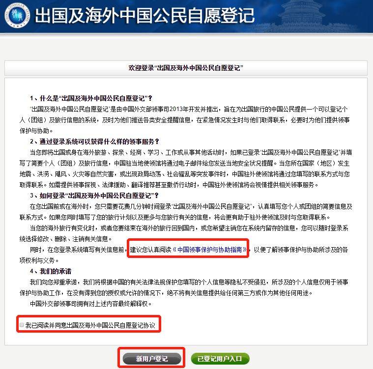 建议小伙伴先认真阅读《中国领事保护与协助指南》然后在“已阅读并同意”处打勾点击新用户登记