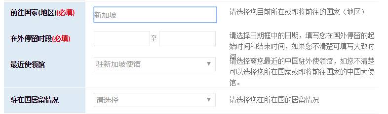 对于在新的小伙伴们,请在前往国家(地区)填写新加坡,最近使领馆填写驻新加坡使馆。