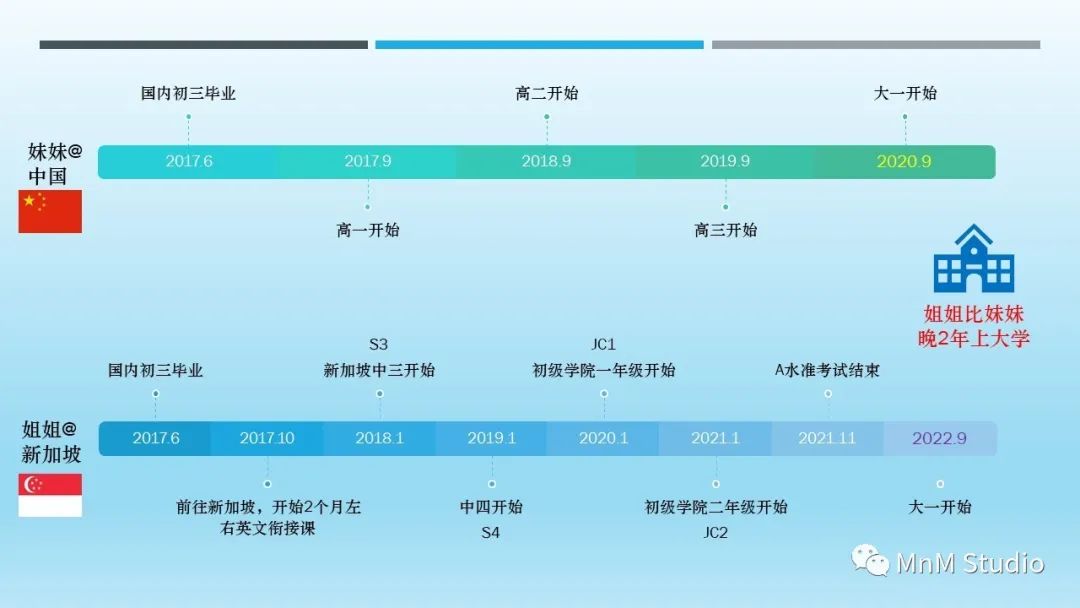 因为学制及重复一年初三的现实,参加新加坡SM1项目必然会比同龄人晚2年进入大学。也就是你上大学一年级的时候,你的同学开始大三了,怎么算出来的2年,见下图。我以一对双胞胎姐妹来进行模拟,为什么选女生,因为没有参军因素的影响。男生拿绿卡PR、参军等等,以后再聊。这样你就无形的比国内人少了2年。至于新加坡SM1项目的经历是否值这2年时间,众说纷纭,我个人认为非常值得。