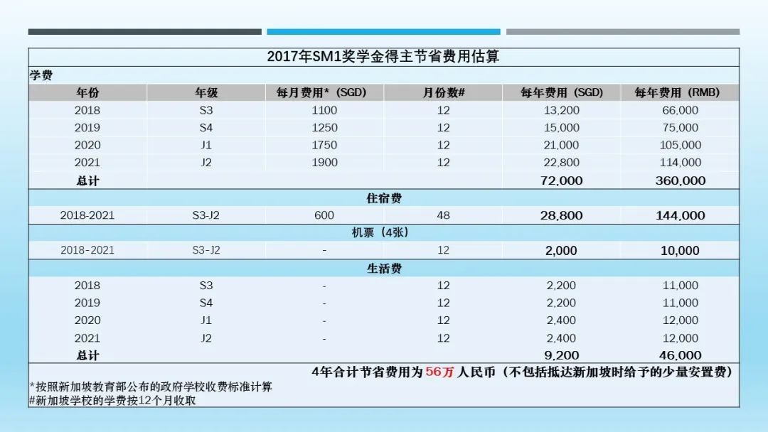 说了以上这么多能力培养方面的优势,再说一些物质方面的。我们在上篇中谈到,新加坡SM1项目中,学生4年的学费、住宿费全免,还有生活补贴、安置费和机票补贴。虽说新加坡自费留学的费用没有欧美高,但那也是不少的一笔钱。我以一名2017年SM1奖学金得主在2018-2021年间在新加坡就读,大概估算一下节省的学费、住宿费、生活费以及机票,不包括抵达新加坡时给予的少量安置费,总节省费用大概在56万人民币。家长需要支付的应该只有课本费、额外的生活费、手机费以及其他不多的花费。