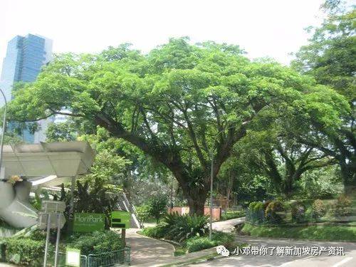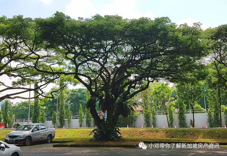 雨树在岛国几乎无处不在,可称为新加坡的"国树"。不论是公园里,邻里住宅区,露天停车场,行人走道, 大学校园里和大部分的高速公路两旁,只要一出家门甚至不用出门,放眼望去,都是雨树那婀娜多姿的身影,一排排,一片片,每一颗的枝叶向四面散开,美如华盖,又如骄阳下一把把绿伞,为路人撑起一片阴凉,遮阴挡雨。