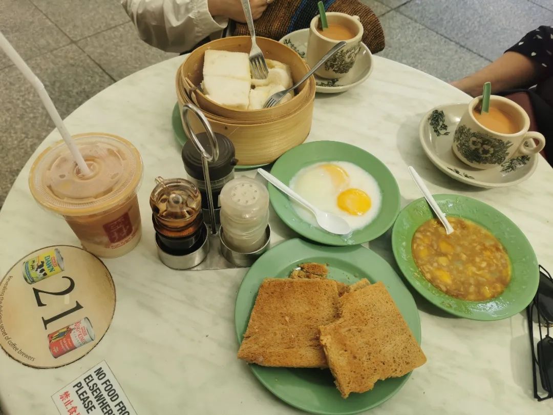 进店就先被骂一顿,让我不要站在柜台前看菜单直接坐下,坐下以后十几分钟都没有人理我们,因为服务员少客人多每个人都应接不暇,而且店里的服务员都是些年迈(又凶)的老头老太。经典的咖椰牛油吐司套餐里面有吐司+半熟鸡蛋+饮料(可选),吐司脆脆的,但酱有点略甜,吃多了容易腻。人均40rmb左右