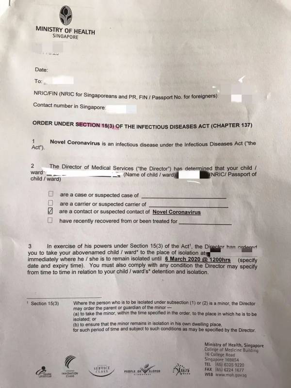 图源:新加坡卫生部 2020/1/28 教职员学生返新先请假隔离 1月28日起所有从中国回到本地的学生教职员与医护人员必须申请两周的假期Leave of Absence。针对的是所有教育部学校包括幼儿园、中小学、特别学校、初院及励仁高中、理工学院与工艺教育学院。