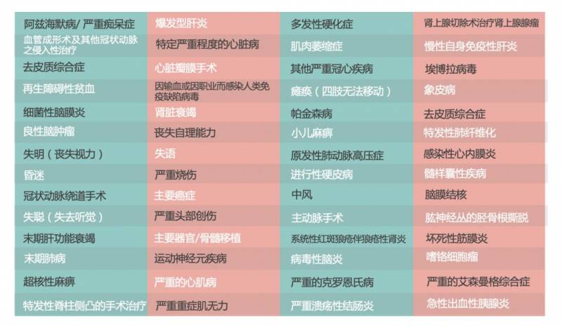 危重疾病保障利益,即当受保人在人寿保险保障期内确诊重大疾病后,保险公司按保单内容一次性赔付保额给受益人的情况。以下56种重大疾病便是保诚保险公司所保障的危重疾病,其中包含主要癌症、阿兹海默综合症等常见重大疾病。