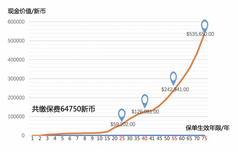 这两种人寿保险最大的差异,便体现在保单是否具有现金价值。保单的现金价值是指带有储蓄性质的人寿保险单所具有的价值。定期人寿保险是没有现金价值的。而配置终身人寿保险后,保险公司每年都会按一定比例分红到终身人寿保单中,构成了终身人寿保险的现金价值。当终身保单有了现金价值后,投保人可以选择取出现金。但需要注意的是,现金价值是复利增长的,过早取出现金价值会影响未来的增长。以25岁配置人寿保险的客户为例,终身人寿保险的现金价值增长曲线如下图,前两年为0,50岁左右持平,65岁左右翻倍。