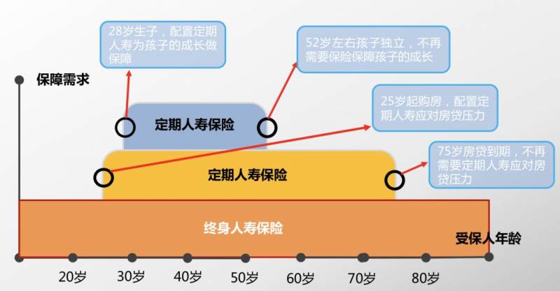 以上图为例,受保人的一生都需要一个基础的经济保障,无论年轻时或是年迈体弱,一旦失去收入能力可以有一笔钱应对生活的基本需求。因此保障年限长达终身的终身人寿保险是基础。在配置了终身人寿保险之后,大家需要根据自己每个阶段的不同,灵活配置定期人寿保险。例如受保人25岁时购房需要还贷,如果在这数十年还贷期间失去收入能力,无法按时还房贷,则整个家庭都会面临无房可住的情况,此时配置一款保额与贷款相当的定期人寿保险是很有必要的。而在购置房产组建家庭之后,大家会结婚生子。有了孩子之后,孩子的抚养教育费用也是整个家庭的经济压力。为防止失去收入能力以致耽误孩子的成长,可以再配置一份定期人寿保险作为补充,用以确保顺利抚养孩子长大。终身人寿保险顾名思义,提供了一生的保障,让受保人年轻时负得起家庭责任,年老病重时不成为子女的负担。而定期人寿的意义也显而易见,在于可以高性价比地转移具有时效性的风险(比如房贷)。因为房贷与抚养孩子的压力都不是伴随一生的,当受保人不再需要承担这些压力后,能即刻停止这一份保障,减少不必要的保费支出也是必要的。此外,得益于定期人寿保险相对终身人寿保险更高的性价比,投保人可以以更低的保费获取更高的保障。终身人寿保险和定期人寿保险由于定位不同,在不同的人生阶段,会发挥着不同的作用。总而言之,二者便是这种相辅相成,互不可缺的关系。