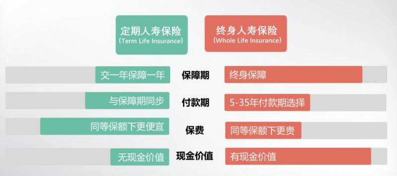 因此,定期人寿保险与终身人寿保险的区别主要体现在付款期不同、保障期不同、同等保额下保费不同别以及保单有无现金价值这四个方面。