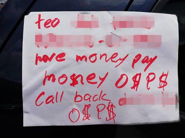 大耳窿泼漆后留下纸条,要求张姓男子欠钱还钱。