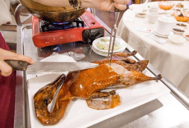 除了点心,酒楼里还提供北京烤鸭(整只鸭$50新币++)等菜肴。外皮被切成薄片,烤鸭的气味以及不断发出的酥脆声使我们垂涎三尺。