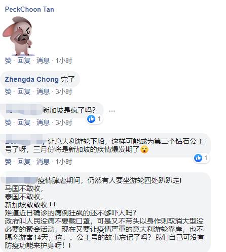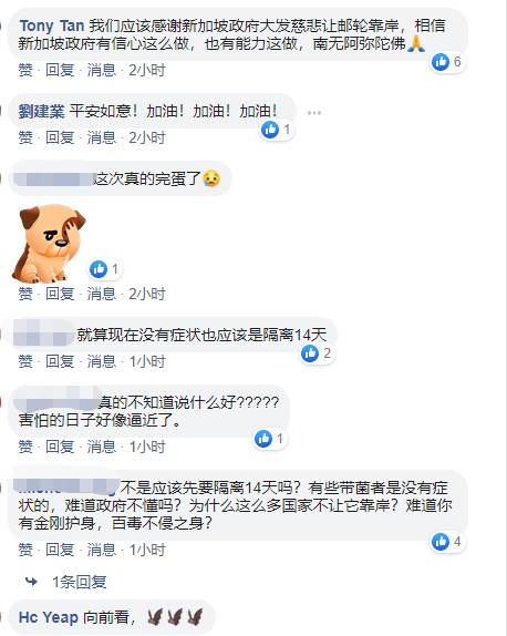 坡岛网友炸锅! 不过,显然当局的保证没有起到作用。 这艘被马、泰两国禁止停靠的邮轮要明天登陆的消息,可是炸翻了坡岛的朋友圈。网友在得知此消息后,纷纷表示不淡定了。有网友感觉:“太害怕了” !还有人说:“现在怎么还有人出行,真是自讨苦吃。”