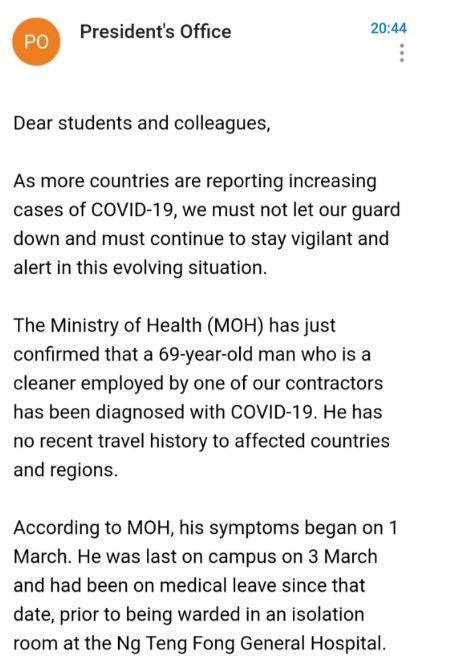 国大一女生违反缺席假被遣返回国 南大(NTU)出现了确诊病例,国大(NUS)这边也发生了与疫情相关的事件。