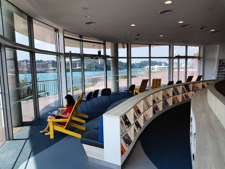 新开放的海滨图书馆提供室内躺椅,如果你需要休息一下,还可以欣赏圣淘沙的美景。