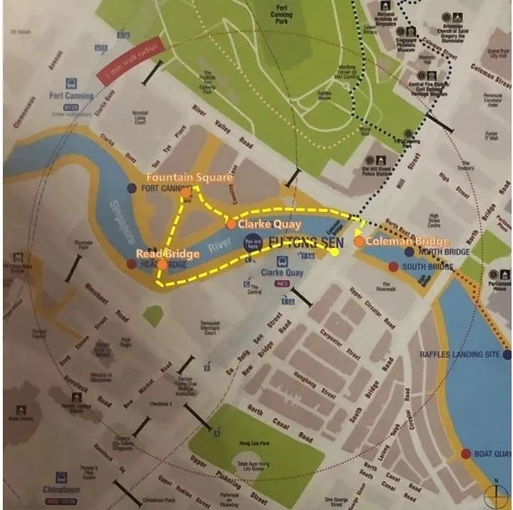 咘咘的游览路径是从新加坡河岸南侧开始,沿着码头对岸商业街走,经过READ BRIDGE进入克拉码头的中心商业街,接着参观湖滨餐饮,最终经过COLEMAN BRIDGE回到出发点。