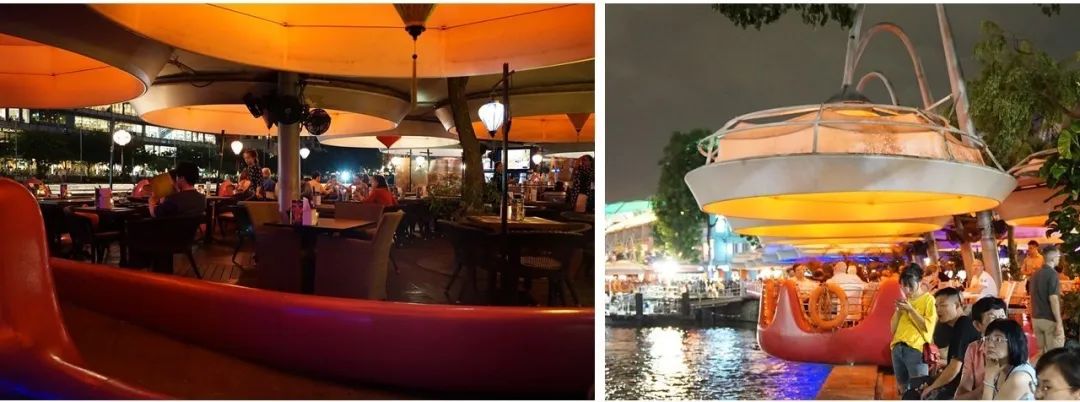 接下来咘咘看到的就是克拉码头人气最旺的沿河亲水商业街了~开放式休憩餐饮空间的增加、色彩斑斓灯光水影效果的营造以及水系纽带的升级利用,改变了克拉码头原本的临水不亲水,充分利用自有的景观资源,丰富了其商业形式。结合东南亚地区多雨的特点,在河岸设置了很多荷叶状景观“雨棚”,“雨棚”往河岸外延伸约1.5米,搭建了架空于河面上的平台,营造了景观极佳的开放式休憩餐饮空间,游客在这里用餐,可以临近饱览新加坡河的美景,而其独具特色的造型本身也成为码头的一大看点。