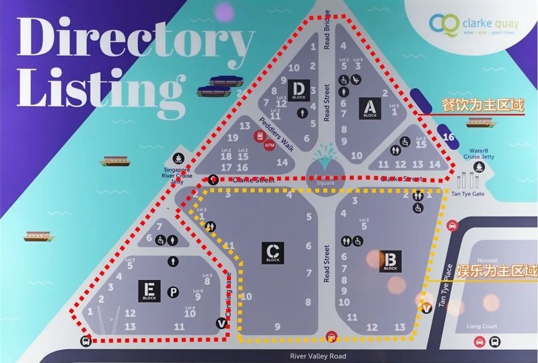 咘咘在经过Read Bridge的时候拍了一张码头的导览图,通过这张图我们可以了解下码头的功能组成与空间布局:码头以广场为中心分为5个区域,以临河距离为依据,进行功能板块的划分,沿河的A、D、E区域主要以餐饮为主,分布了咖啡店、露天水上餐厅等;B、C区域则以娱乐为主,分布了酒吧、购物商店,同时预留了大面积的停车设施。