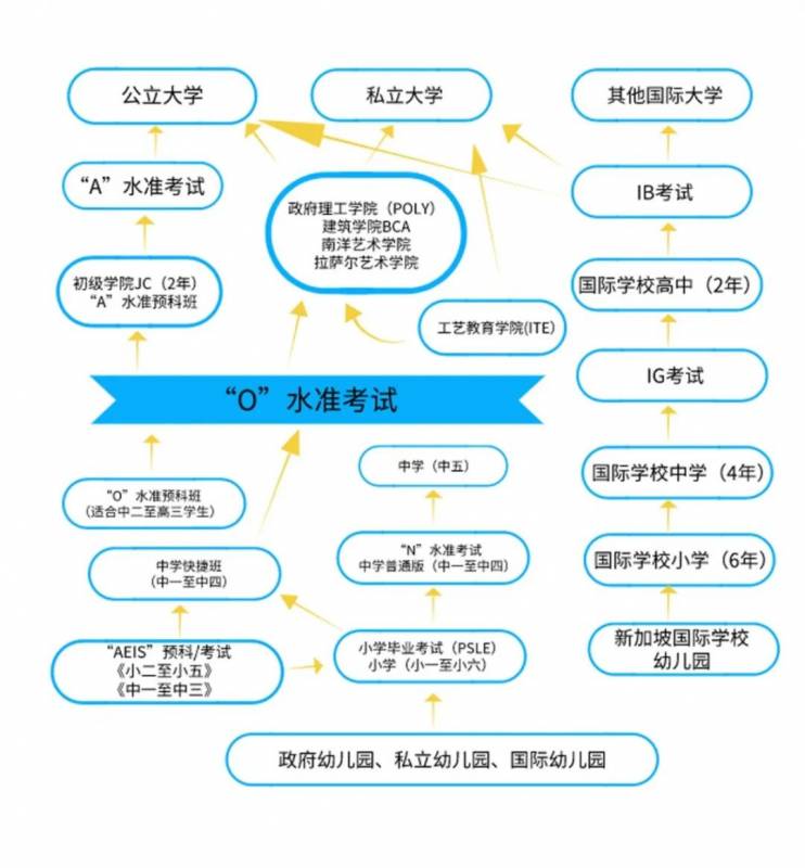 (如PSLE考试、N水准、A水准、O水准等)或者是进入IP计划【即Integrated Programme,允许中学表现优异的学生跳过O-Level 考试,直接进入JC(2年预科)学习O-level课程的计划】
