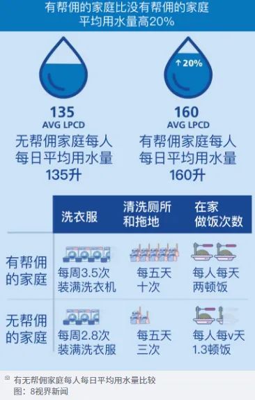 经过访问民众日常发现: 66%的家庭以喷水的方式清洗厕所,而不是马桶冲水; 41.5%的家庭用同样的方法给宠物洗澡,而不是送去宠物店; 50%的家庭在水龙头下清洗食物,而不是使用水果盘清洗; 94% 的家庭在水龙头下洗碗,而不是采用盆装水清洗; 而有帮佣的家庭比没有帮佣的家庭的平均用水量高20% 。