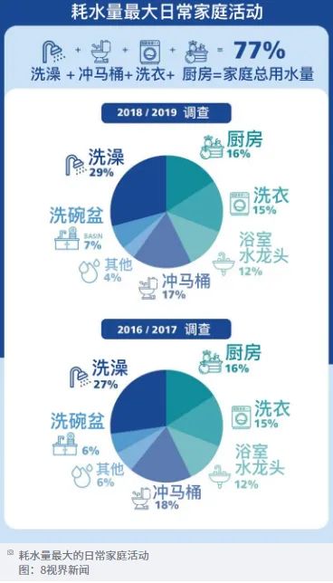 由此,新加坡公共事业局希望到2030年,能做到每人每天用水量130升的新目标。 在这次的的详细调查报告中发现,冲马桶、厨房用水、洗澡以及洗衣占用了77%的家庭用水量,洗澡用水一直居高不下,占用家庭用水量的29%。