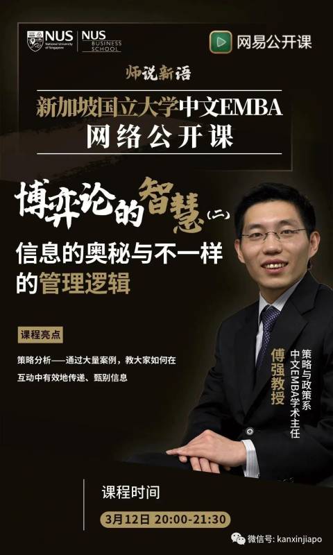 第二期《信息的奥秘与不一样的管理逻辑》,我们将继续探寻博弈论的智慧。周四晚八点,让我们共同开启亚洲顶尖商学院的“云课堂”之旅,体验亚洲排名第一的新加坡国立大学EMBA课堂。