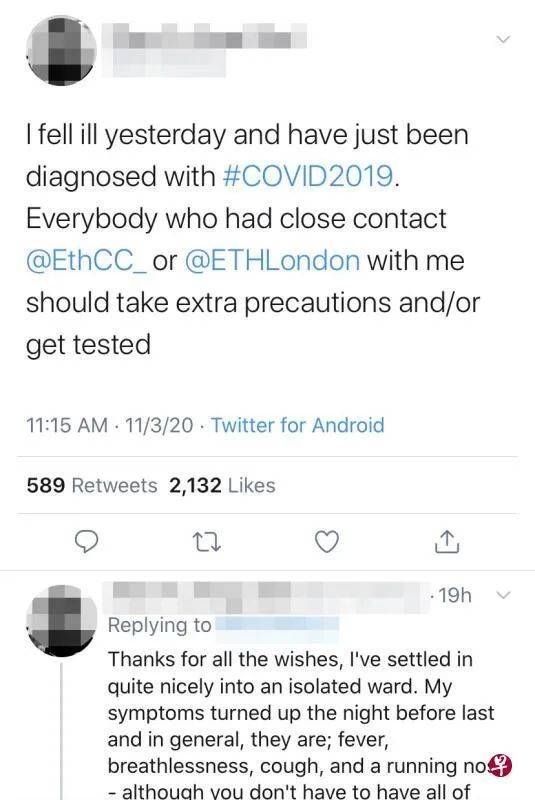 总裁在推特上指出,医生认为病毒“可能来自法国”,但考虑到多数的冠病案例都需要二至14天,才会出现症状,所以他认为病毒来自史丹福区块链会议或丹佛以太坊开发者大会的可能性较少。他也表示,已联系主办方,告知他们自己的情况。