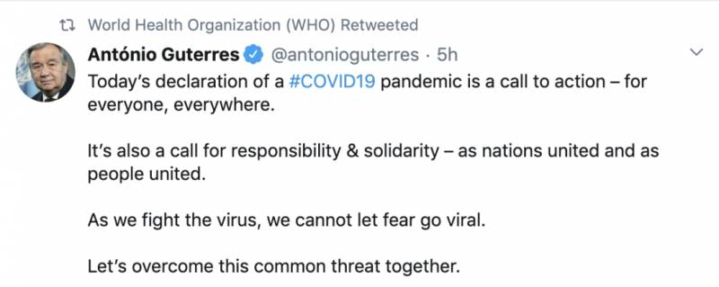 今天,世界卫生组织总干事谭德塞宣布新冠疫情已具有“大流行”(pandemic)特征。疫情的传播程度和严重性令人深感担忧,世卫组织呼吁大家一起齐心对抗病毒。