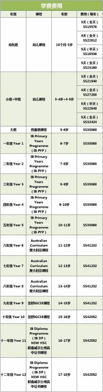 新加坡澳洲国际学校开设了从2个月到18岁的全年龄段的课程。设置了从学前班到高中的不同年级及课程。