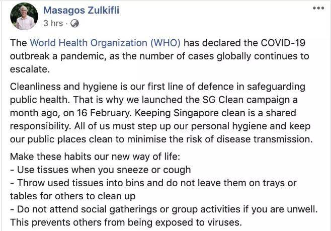 他说,在这段非常时期,保持个人卫生、勤洗手等是新加坡的第一道防线。所有人都必须加强个人卫生并保持公共场所清洁,以降低疾病传播的风险。