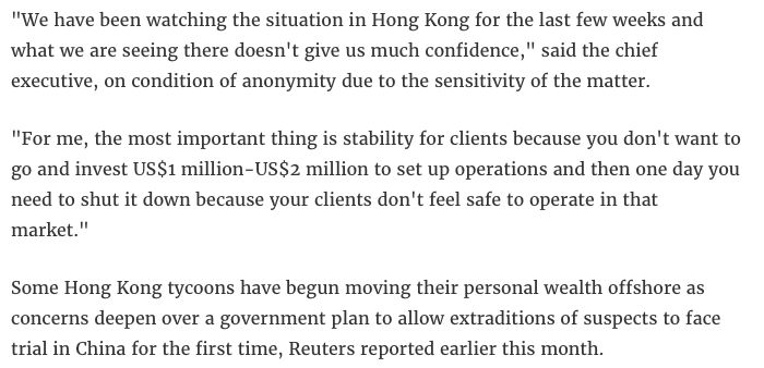 “我们过去几周一直在关注香港的情况,而我们所看到的情况并没有让我们充满信心,”首席执行官表示 “对我来说,最重要的是客户的稳定性,因为你不想去投资100万美元到200万美元来建立运营,然后有一天你需要把它关闭,因为你的客户感觉不到在该市场中安全运营。“ 一些香港大亨已经开始将个人财富转移到境外,因为人们越来越担心政府计划允许引渡嫌疑人首次在中国接受审判。