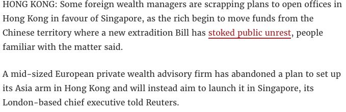 据知情人士透露 一些外国财富管理机构 正在取消在香港开设办事处 以支持新加坡的计划 因为富人开始从中国领土转移资金 新的引渡条例草案引发了公众的不安