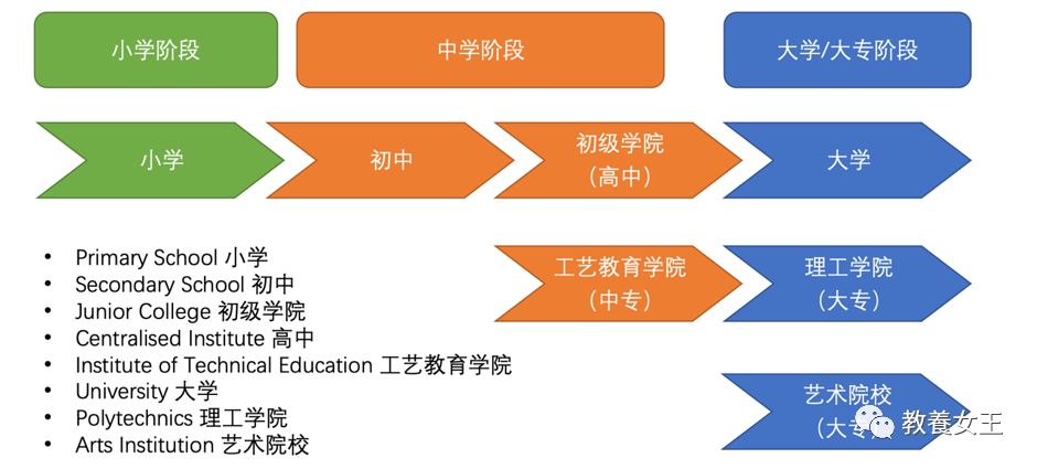 新加坡教育大致可以分为三个阶段,小学、初中和初中后阶段,为了方便理解,以下图片将其对应到中国的小学、中学和大学阶段。