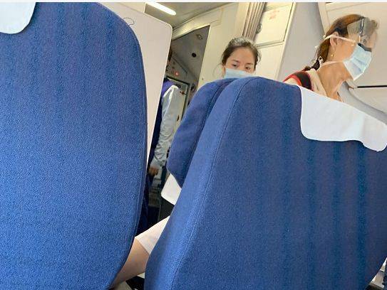 (原来这些座位满满当当,许多人只能坐在地毯上,但如今空空荡荡)登机后,机上空乘们严阵以待,空姐戴着护目镜,双层手套,在起飞前禁止乘客使用卫生间,怕会有“气溶胶”感染,我猜可能是起飞后的空气清洁系统不一样吧,所以……