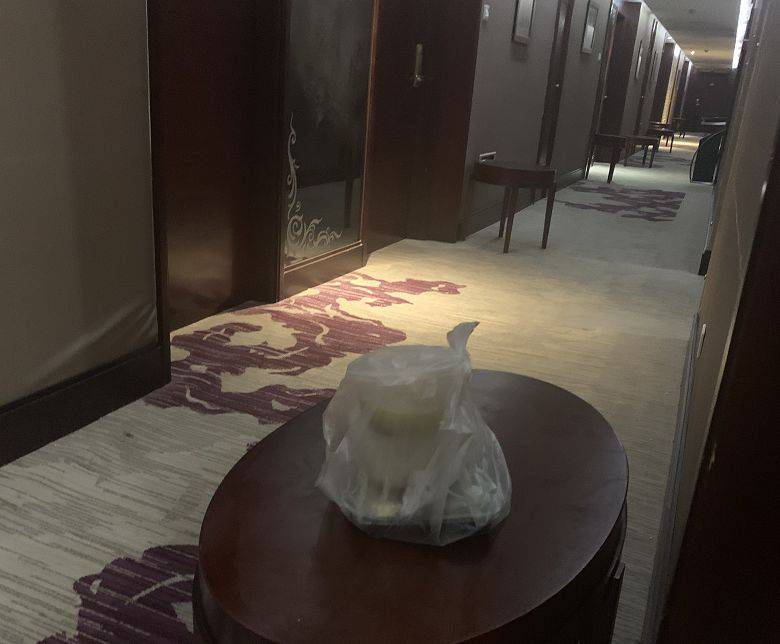 各人门口有个小台子,工作人员会准时送一日三餐,在敲门后三分钟隔离者开门领餐,垃圾袋放在门边每天有人会来取。如果需要生活用品,可以叫家人送到前台,同样到这个小台子上收。