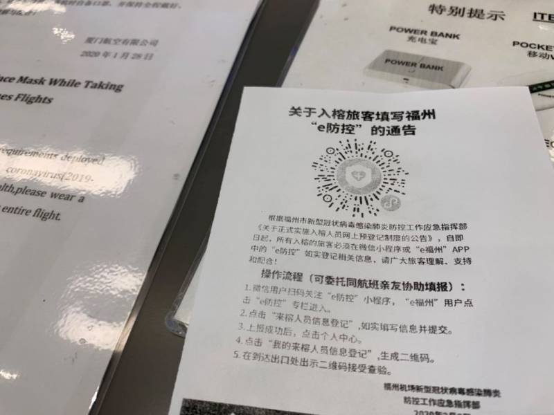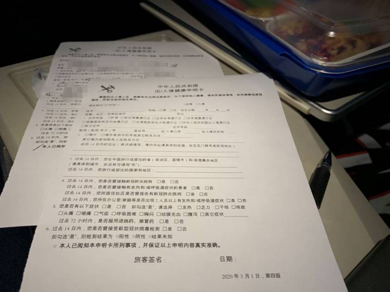 看起来毫无食欲,但,意志品质薄弱的我,还是剥开了它层层包装,摘下口罩随便吃了点垫垫肚子。一路平稳飞行,准时到达福州,在途中,空姐按要求让我们填写一份出入境健康申明卡,要详细填写航班号、备用联系方式、身体情况、过往经历(是否有接触史)等,这个是3月1日印刷的最新版本。