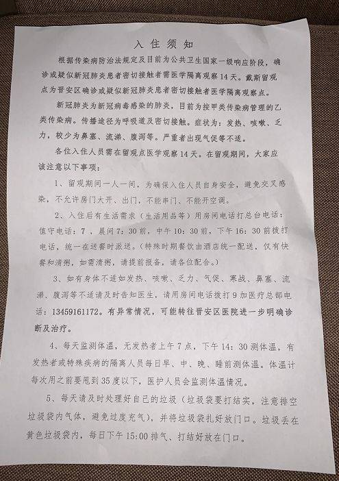 我以为,我们会分装上一辆小巴,万万没想到……一辆救护车停在了我们面前!乘坐着救护车,我来到了晋安区的隔离酒店。进入酒店前,又测了一次体温。然后有专人带我们乘坐货梯上房间,我们领到一个护理包,里面有一个一次性口罩,两个垃圾袋,一张入住须知和一支体温计。