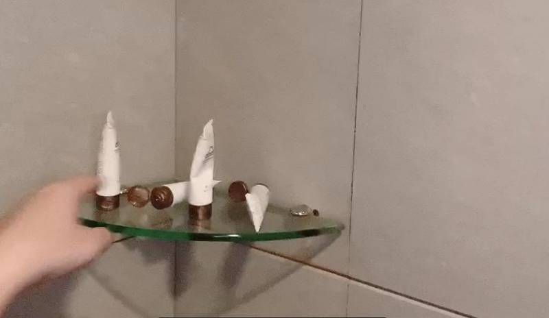 浴室里台子上洗护用品被人使用过还未清理,开盖散落四处,我不敢碰触。