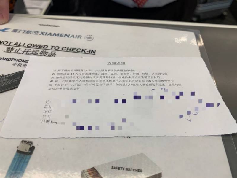 3月11号下午14点,我们到机场前台办理登机手续,果然被提示有被隔离的风险,并要求签订自愿付费隔离的单据,并在APP里申报旅行史以及归国时间等等。