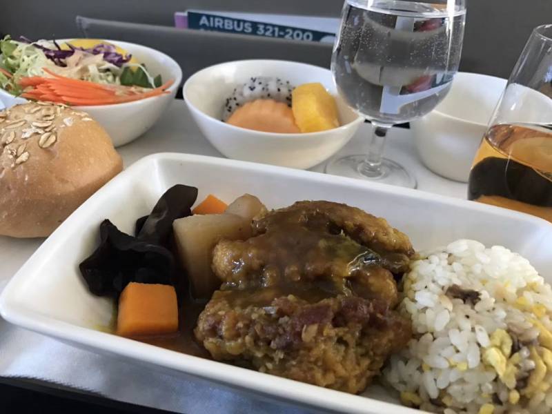 这班飞机于下午4点15分从新加坡起飞,预计8点半左右到达福州,正好撞上餐点,原来商务舱的餐是这样的,热菜热汤果汁饮料偶尔还有三文鱼做小食。