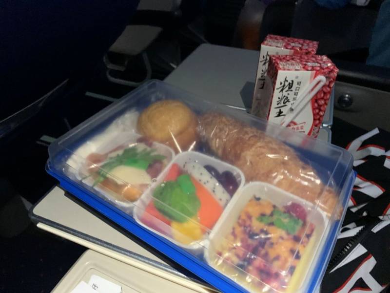 但非常时期,商务舱的餐就变成了这样,面包、冷食、所有饮品均独立包装。