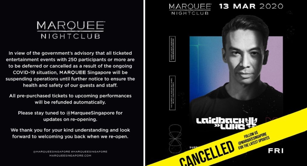 建议延后或取消所有超过250人出席的文化艺术、体育和娱乐售票活动。有鉴于此,Marquee为了确保顾客和员工的安全,决定暂停营业,直到另行通知。