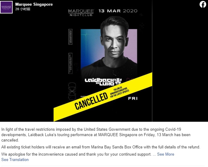 Marquee在早前的另一个帖文里已经宣布取消一名电子音乐DJ Laidback Luke的表演。这名来自美国的DJ原本昨天在夜店内表演,不过因为美国推出的旅游限制而被迫取消。