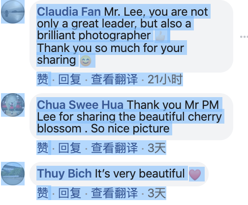 怎样?是不是对李显龙总理的摄影技术大加赞赏!网友们纷纷点赞留言,大家表示李显龙不仅是一位伟大的领导人,而且也是一位天才的摄影家。这么美的樱花在李显龙的镜头下被表现的淋漓尽致。