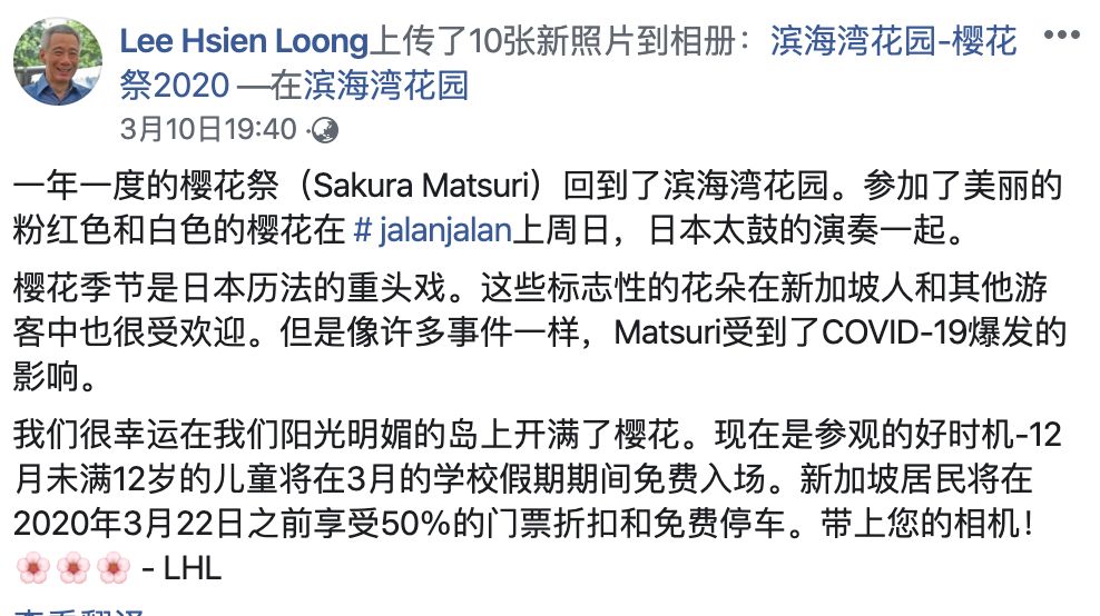 李总理喊你打卡樱花啦李显龙上周日去滨海湾樱花展游玩,他在facebook上发文,表示现场热闹非凡,大家不仅可以欣赏到多达20个品种、500棵的樱花树,而且还有各类传统民俗表演,以及日式茶道,让大家在观赏之余还可大饱口福。李显龙表示现在正是欣赏樱花的好季节,未满12岁儿童将在3月份学校假期内免费参观,而新加坡居民将享受50%的门票折扣,他呼吁大家都带上相机来亲自领略樱花的美。