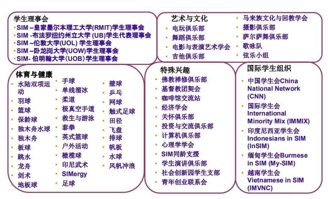 SIM社团活动非常精彩,校园内有超过70种学生社团,活动全年不断,让学生有机会参与艺术、文化及体育活动,甚至专业技能培训。积极发展个人的沟通技巧与领导才能,并促进个人成长及开拓社交机会与联系,为未来的成功之旅打好基础。