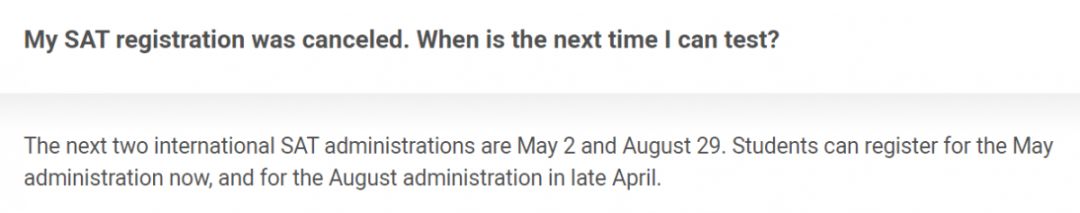 而在2月College Board宣布取消中国大陆考生3月份SAT考试之后,随即确认在今年8月29日增加一场考试,并将在4月下旬开放报名。