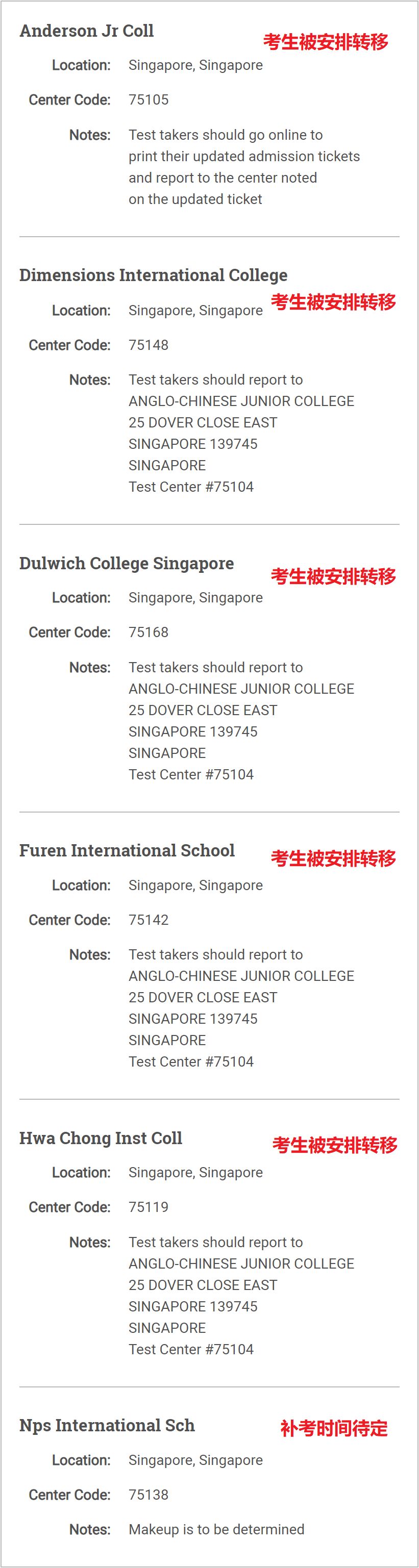 即补考时间待定(Makeup is to be determined),涉及的考生需要每天登陆CollegeBoard 官网查询最新消息,直到看到所在考点的“Notes”一栏出现了新安排的考试日期和考点后再打印新的准考证。