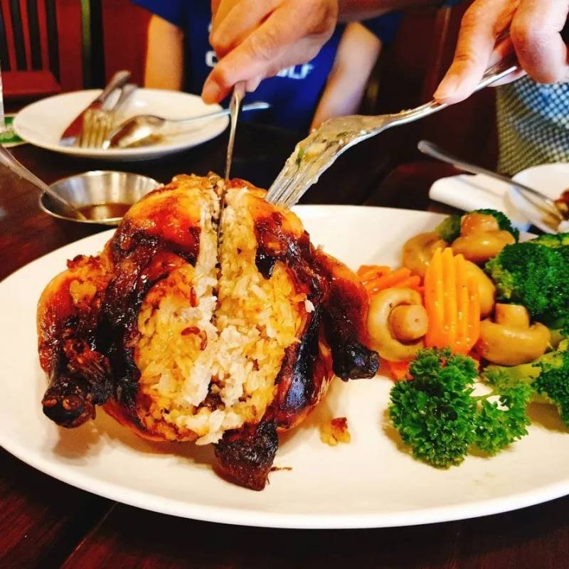 这家店的招牌烧鸡也与众不同,里面是满满的糯米,栗子和冬菇。烧鸡的香和糯米的香完美的融合在一起,一口咬下去非常满足。餐馆像是英国乡村小镇,时常有老外来吃。特别是晚上,再来杯啤酒,周末很酷!