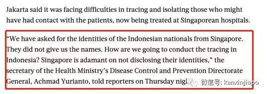 根据《雅加达邮报》报道,印尼官员强烈谴责新加坡卫生部做法:“我们已经要求新加坡人提供印尼国民的身份。他们没有给我们名字。我们将如何在印度尼西亚进行追踪?”