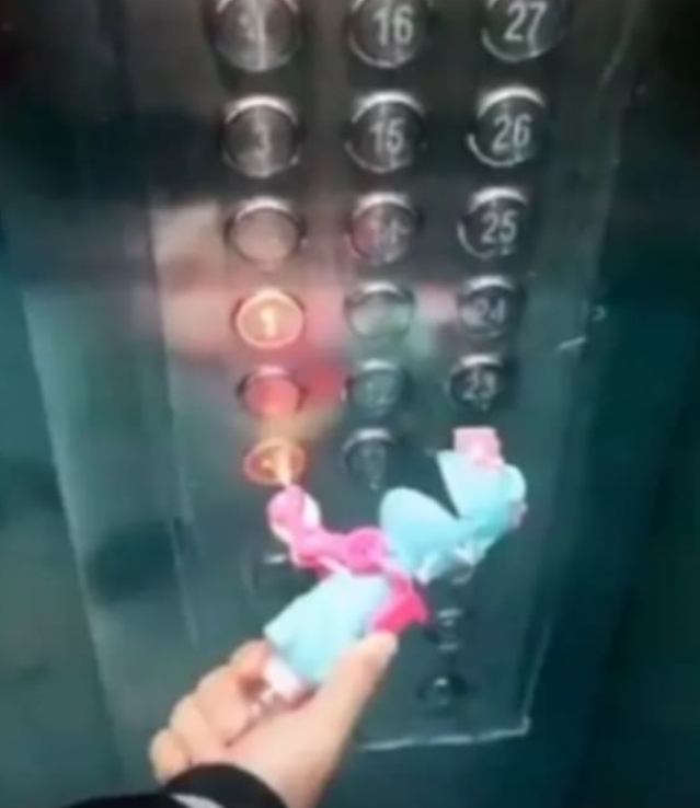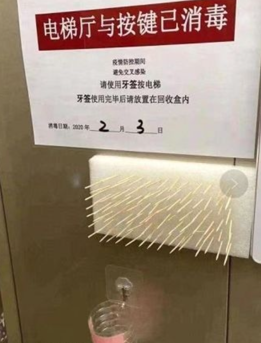 用插在里头的棉花棒按电梯按钮,帖文写道“哇,用这招按电梯按钮非常棒”。
