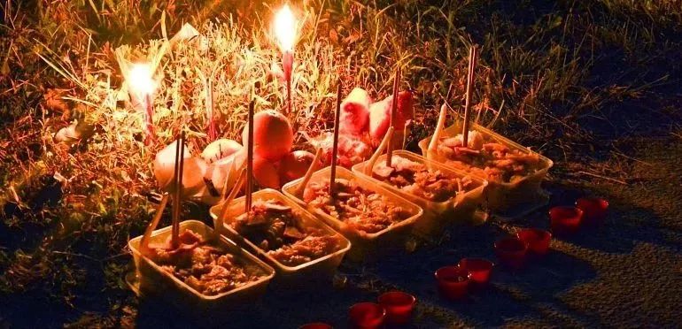 农历七月的时候,你会看到路边花坛里、草丛中、凉亭下面,到处都摆着香炉与食物!请注意!这些物品请千万不要碰!因为......这些都是当地人供奉给逝去的先人的物品。